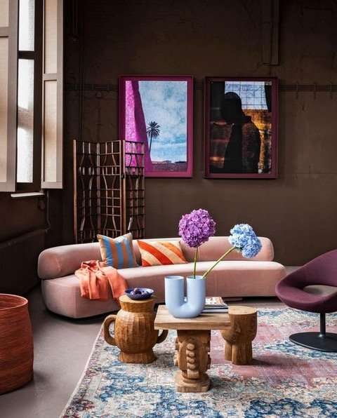 - Een van de mooiste materialen om mee te werken in deze kleurenmix? Blank hout. Dat werkt neutraliserend en als verbindende factor met het sprankelende champagne roze.