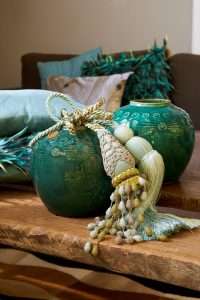 Natuurlijk hoeft niet meteen je hele huis in vijftig tinten groen; je kunt bijvoorbeeld kiezen voor een wand in je lievelingsgroen, een stilleven van allerlei groene accessoires of een zelfgemaakte pompon in modekleur smaragdgroen.