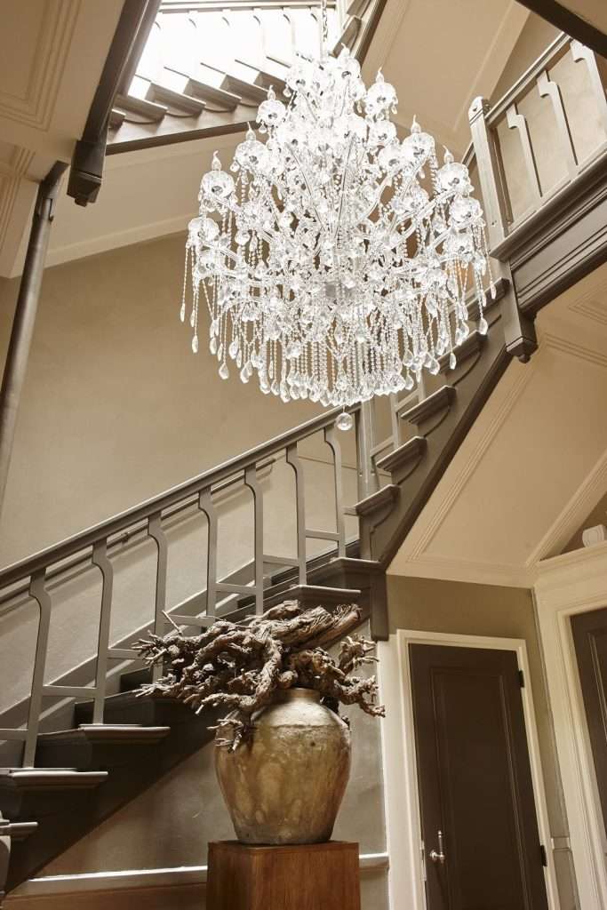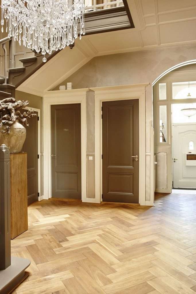 Via een kleine hal kom ik binnen in een grote gezellige gang met zilverkleurige wanden, die prachtig aansluiten op de klassieke taupe geverfde trap en de klassieke eikenhouten visgraatvloer. Door het hoge glazen dak valt een sprookjesachtig licht op de enorme kristallen kroonluchter, die midden in het trappenhuis hangt. De deuren om de trap en in de hal zijn ook allemaal in warme taupe kleur geschilderd. Als gastvrouw Jolanda me vol ontzag naar boven ziet staren, grinnikt ze: “Dit huis heeft 26(!) deuren. Allemaal in originele staat.” In licht Rotterdams accent voegt ze er bijna verbaasd aan toe: Dat kun je toch niet geloven?”