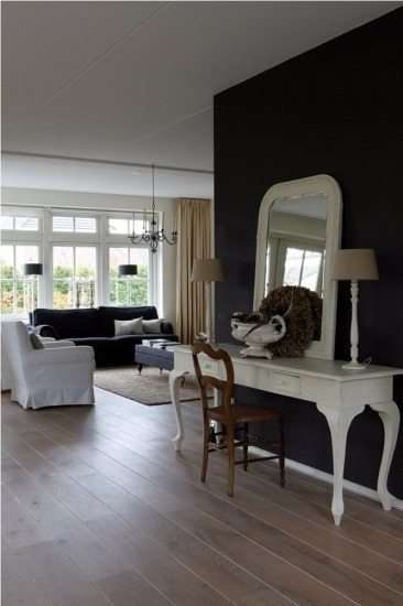 Ruim een jaar zijn Hendrik en Heline bezig met de opbouw. “Tijdens deze periode ging ik al aan de slag met het interieur. Omdat we zelf bouwden, was het belangrijk om vroeg te weten waar we bepaalde lichtpunten wilden, of op welke plek de haard zou komen. Qua inrichting kon ik al mijn ideeën kwijt in mijn eigen huis. In de keet bij de bouw hing een groot bord, vol plaatjes uit woontijdschriften met dingen die ik mooi vond: oud houten tafels, verschillende grijstinten, oude potten, een haard met betonlook. Kortom een mix van natuurlijke, warme en landelijke elementen met hier en daar een moderne touch.”